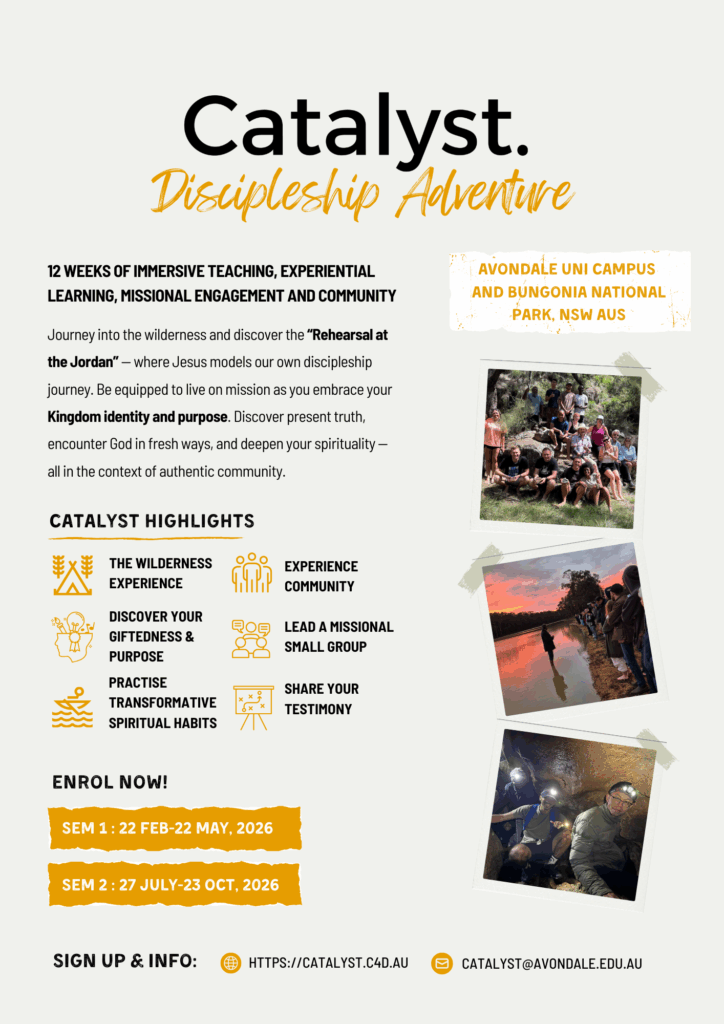 Catalyst is a transformative discipleship experience hosted by the South Pacific Division, Institute4Discipleship- born out of the vision to see the emergence of Jesus-centered, Spirit-filled, disciple-making movement across the South Pacific. Since 2023, Catalyst has been offered as a 12-week short course at Avondale University. To reach even more people, we’ve recently curated shorter formats in our 7-day Catalyst Express and weekend events hosted by local conferences.